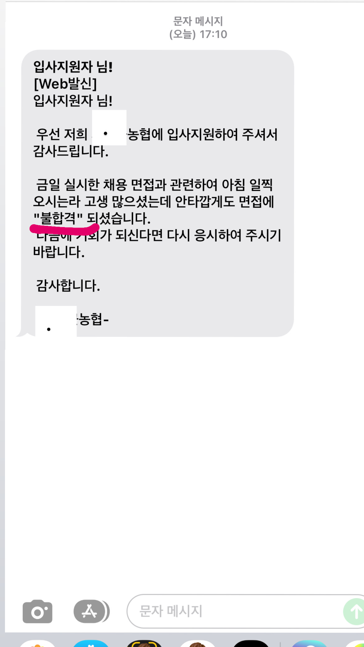지역농협 면접결과는 '불합격' 이었다.